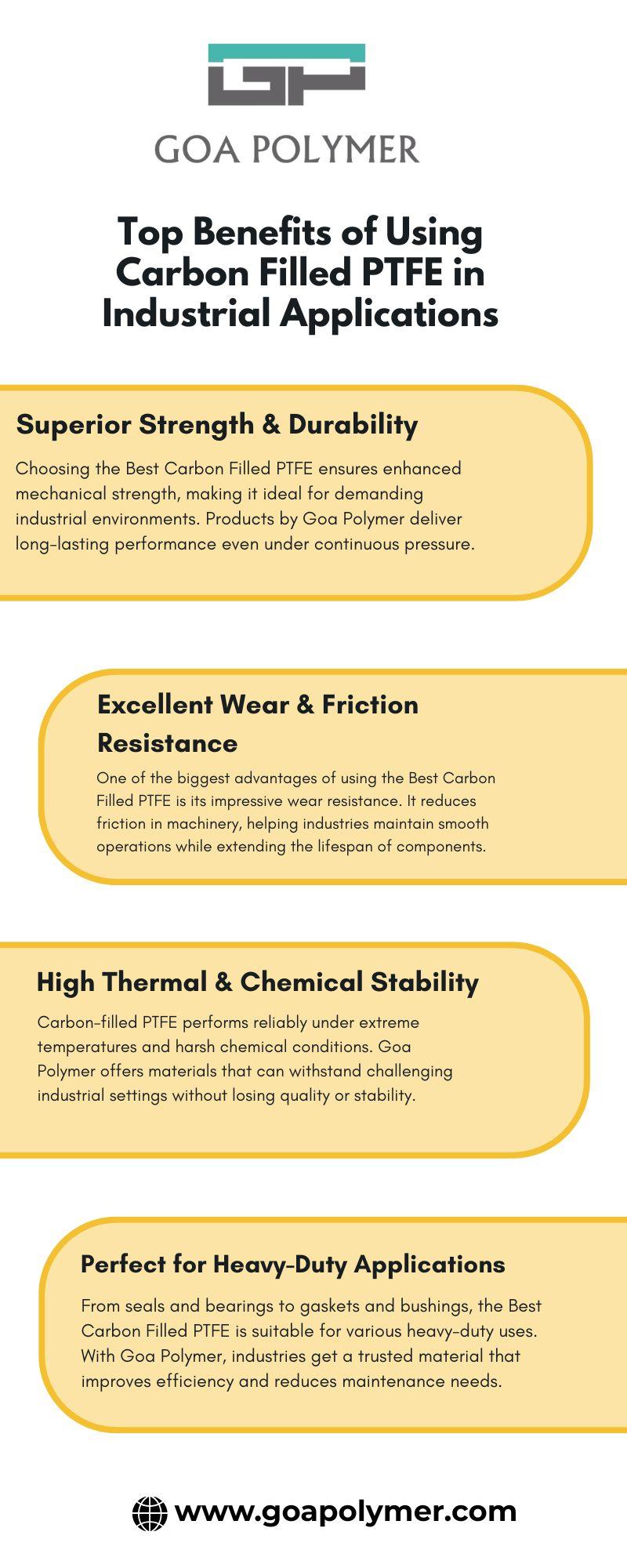 Visit Here - https://www.goapolymer.com/product/best-carbon-filled-ptfe/Top Benefits of Using Carbon Filled PTFE in Industrial Applications 1. Superior Strength & Durability Choosing the Best Carbon Filled PTFE ensures enhanced mechanical strength, making it ideal for demanding industrial environments. Products by Goa Polymer deliver long-lasting performance even under continuous pressure. 2. Excellent Wear & Friction Resistance One of the biggest advantages of using the Best Carbon Filled PTFE is its impressive wear resistance. It reduces friction in machinery, helping industries maintain smooth operations while extending the lifespan of components. 3. High Thermal & Chemical Stability Carbon-filled PTFE performs reliably under extreme temperatures and harsh chemical conditions. Goa Polymer offers materials that can withstand challenging industrial settings without losing quality or stability. 4. Perfect for Heavy-Duty Applications From seals and bearings to gaskets and bushings, the Best Carbon Filled PTFE is suitable for various heavy-duty uses. With Goa Polymer, industries get a trusted material that improves efficiency and reduces maintenance needs. Visit Here - https://www.goapolymer.com/product/best-carbon-filled-ptfe/0 Comments 0 Shares 152 Views 0 Reviews - 0 Comments 0 Shares 79 Views 0 Reviews