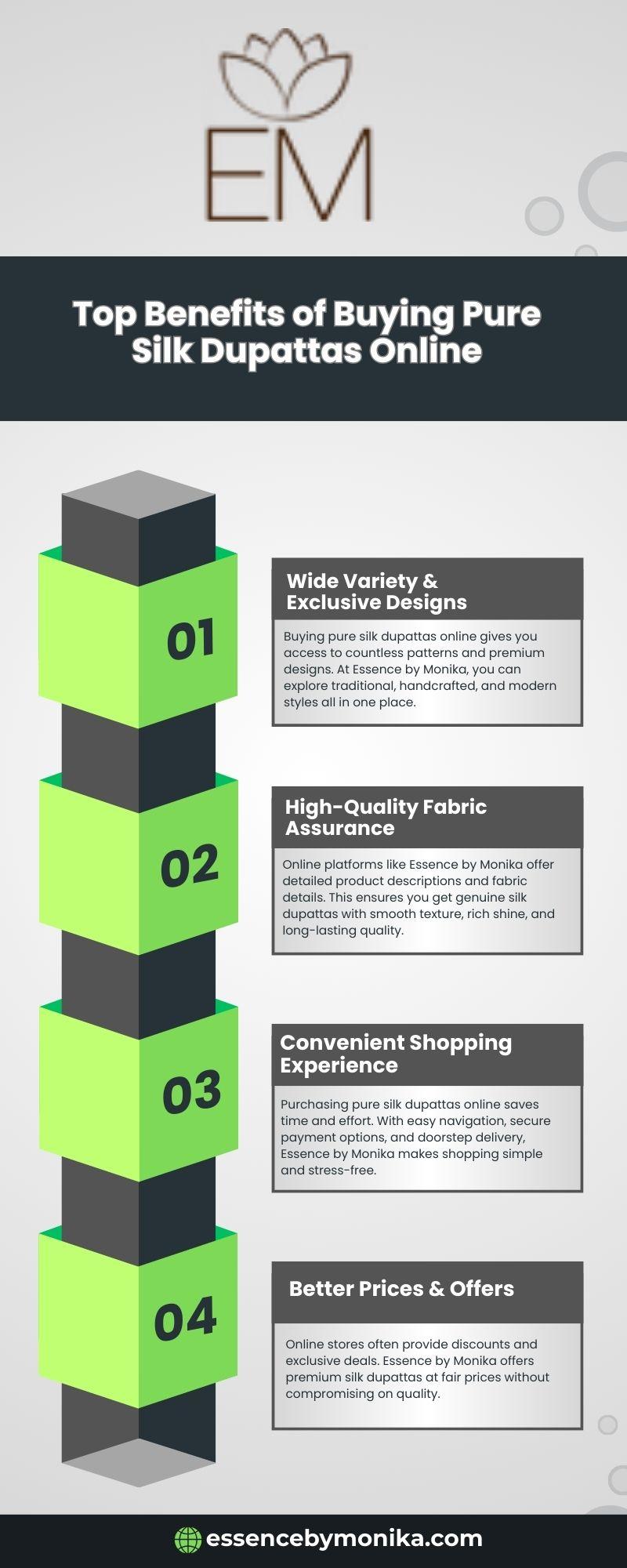 Purchasing pure silk dupattas online saves time and effort. With easy navigation, secure payment options, and doorstep delivery, Essence by Monika makes shopping simple and stress-free.