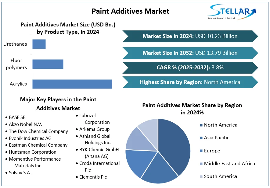 According to industry analysis, the global Paint Additives Market was valued at approximately USD 10.23 billion in 2024 and is projected to reach USD 13.79 billion by 2032, growing at a CAGR of 3.8% during the forecast period (2025–2032).