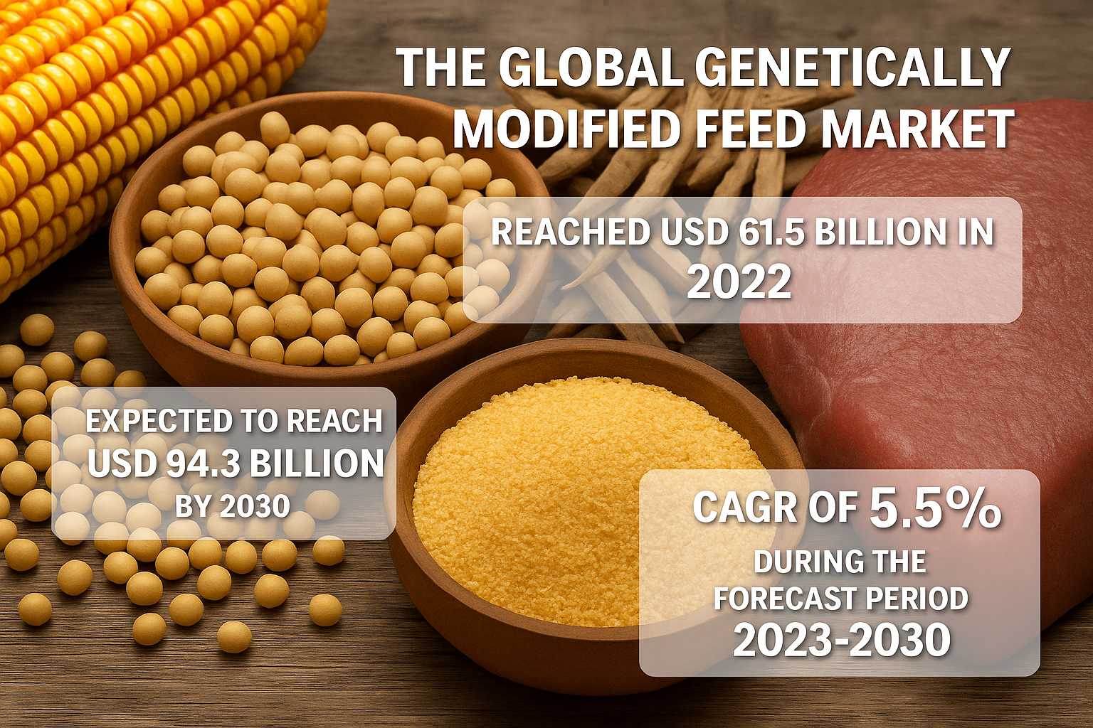 The Global Genetically Modified Feed Market reached USD 61.5 billion in 2022 and is expected to reach USD 94.3 billion by 2030 growing with a CAGR of 5.5% during the forecast period 2023-2030.