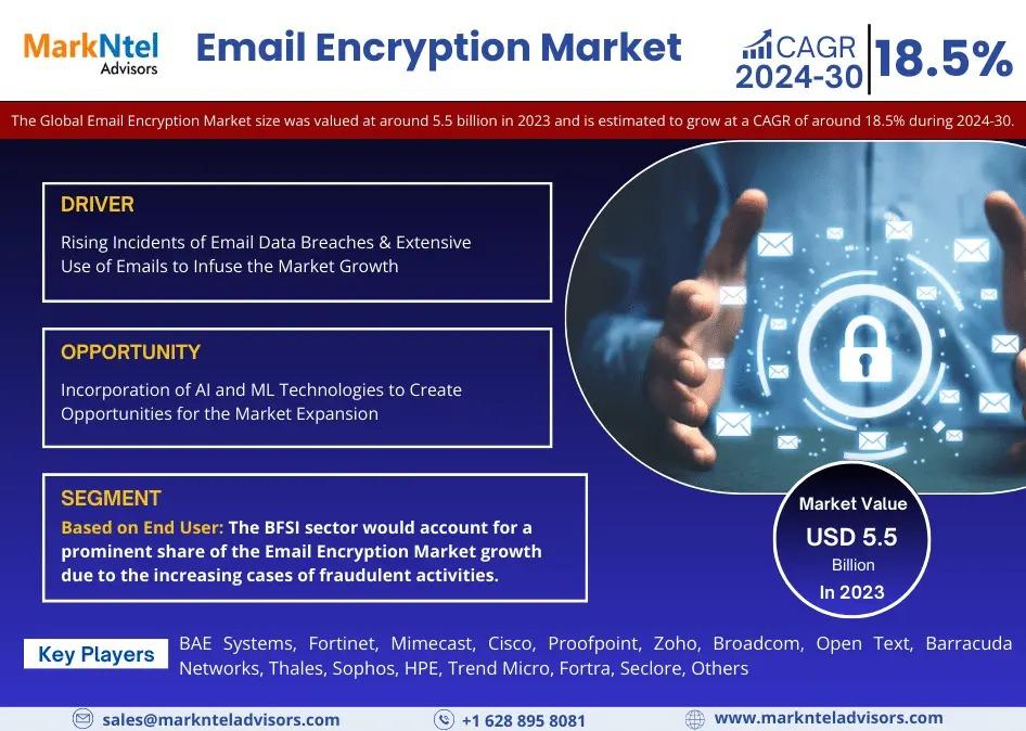 MarkNtel Advisors, a leading market research and consulting firm, has announced the release of its latest study titled Email Encryption Market Research Report: Forecast (2024-2030). This report provides a detailed assessment of the Email Encryption Market, covering its evolving dynamics, emerging trends, key growth drivers, major challenges, and competitive landscape.