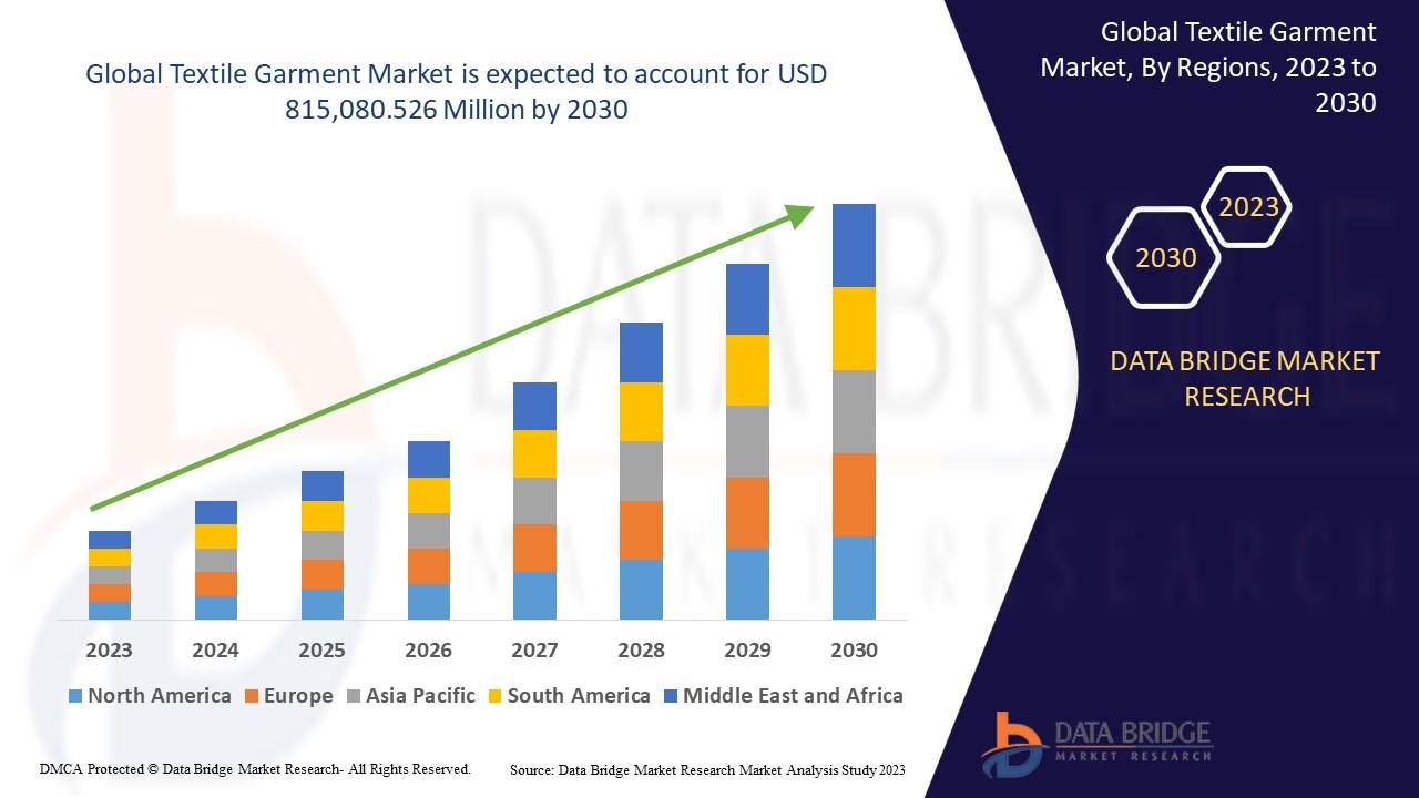 The global textile garment market is expected to grow significantly in the forecast period of 2023 to 2030. Data Bridge Market Research analyses that the market is growing with a CAGR of 4.2% in the forecast period of 2023 to 2030 and is expected to reach USD 815,080.526 million by 2030. The major factor driving the growth of the textile garment market is the inclination toward the latest fashion trends among the young generation is expected to drive the market growth.