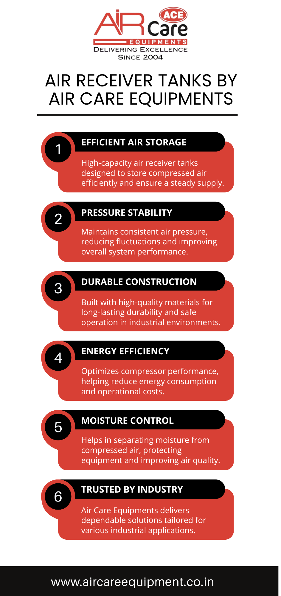 Air Care Equipments offers industrial air receiver tanks designed for optimal air storage and consistent pressure control. Our tanks improve compressor efficiency, reduce load cycles, and enhance overall system performance. Ideal for various industries, they ensure durability, safety, and reliable operation.
