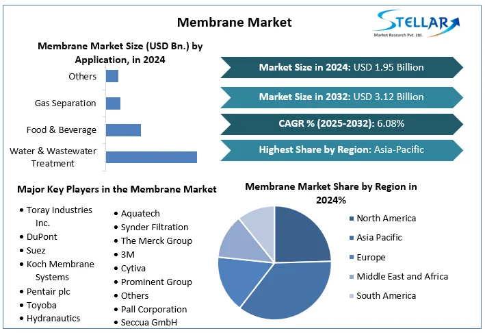 The global Membrane Market — defined by semi-permeable barrier films that selectively allow certain molecules or particles to pass through — is expanding steadily as industries and governments focus on water treatment, environmental protection, and efficient industrial processes. Semi-permeable membranes such as microfiltration (MF), ultrafiltration (UF), nanofiltration (NF), and reverse osmosis (RO) are core separation technologies used across water and wastewater treatment, food and beverage processing, gas separation, and other high-value industrial applications. According to market research, the membrane market was valued at about USD 1.95 billion in 2024 and is projected to grow to approximately USD 3.12 billion by 2032, exhibiting a compound annual growth rate (CAGR) of about 6.08 % between 2025 and 2032.
